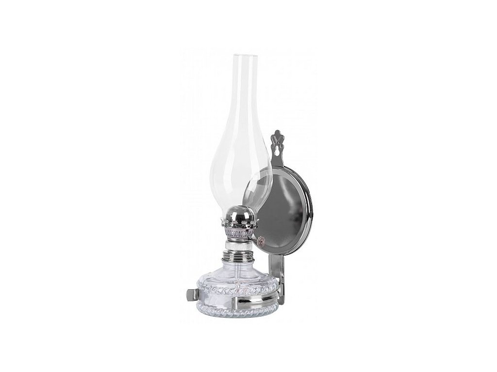 Petrolejová lampa se skleněným cylindrem a zrcadlovým reflektorem. Cylindr zajišťuje optimální hoření a stabilitu plamene. Zrcadlový reflektor směřuje světlo plamene žádaným směrem. Petrolejové lampy lze postavit nebo také zavěsit na stěnu.