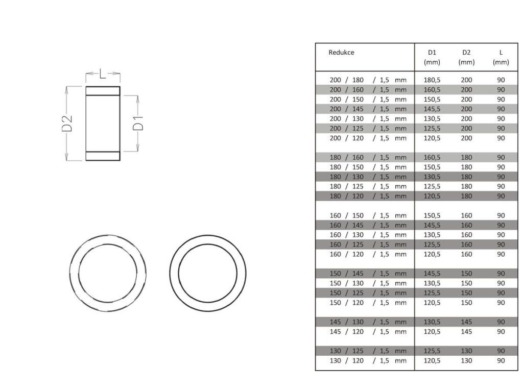 První rozměr komínu ( vnitřní ) /druhý rozměr hrdla kamen ( vnější ) . Redukuje přechod mezi komínem s větším průměrem a kouřovodem s menším průměrem. Redukce je uzpůsobena k zasunutí do hrdla nerezového a zděného komínu.