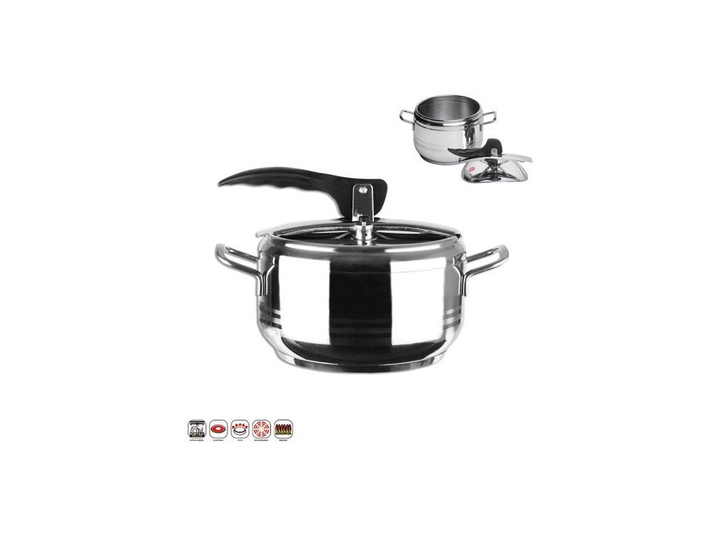 Kvalitní tlakový hrnec o objemu 3,5 l s víkem s pákovým mechanismem a třemi typy bezpečnostních ventilů, vhodný pro rychlé vaření na všech typech sporáků, včetně indukce. Je vhodný do myčky. Rozměry: š. 30cm x v. 13cm (bez poklice) x pr. 21 cm x obj. 3,5l.